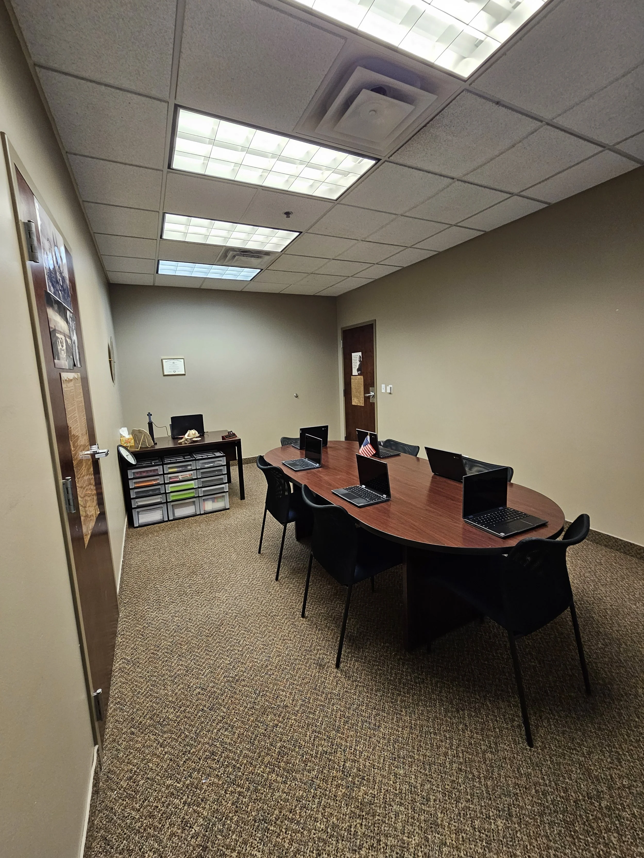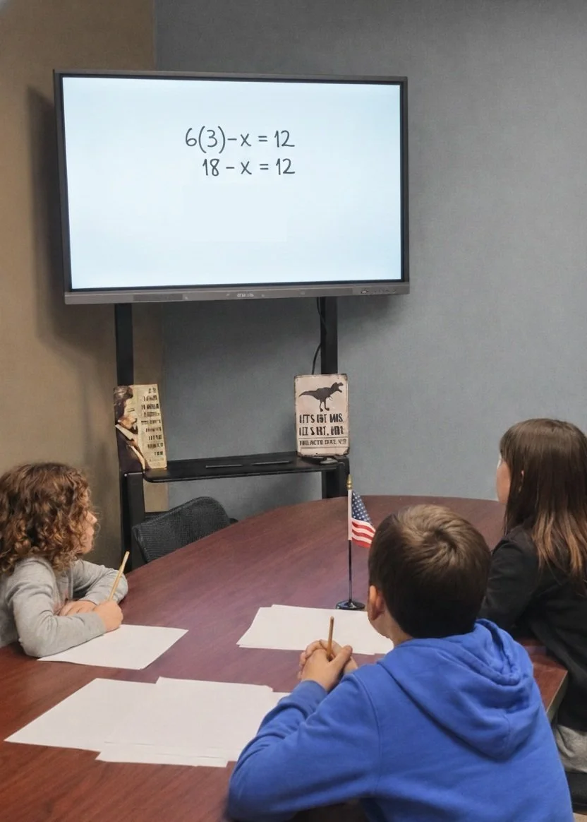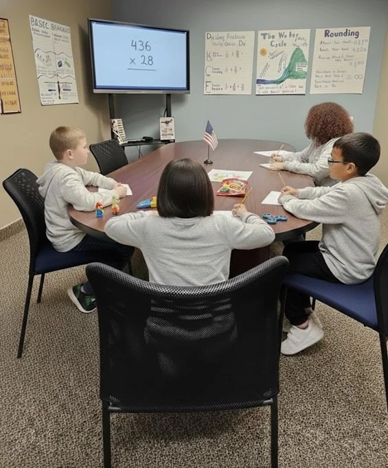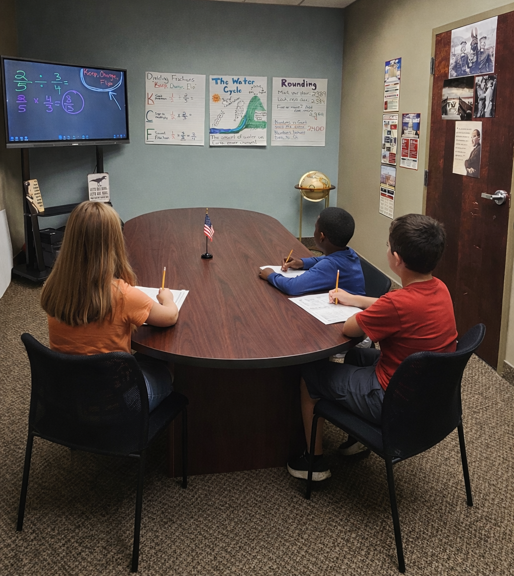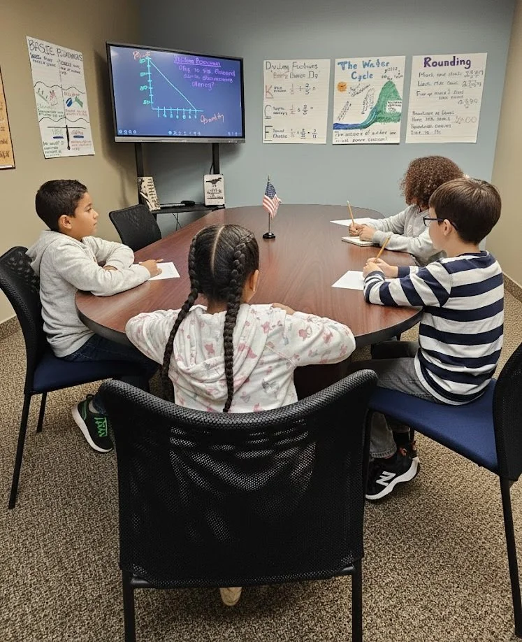 The classroom accommodates 6 to 8 students at a time, allowing for true small-group instruction, business simulations, guided practice, and structured discussion. This size ensures every student receives direct attention and consistent expectations while also benefiting from collaborative learning.